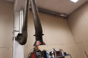 Er is inmiddels een lasdamp afzuiger geplaatst die de lucht via buizen en een ventilator boven de spuitcabine naar buiten blaast. Hij is met de knop in de metaalplek aan en uit te zetten.