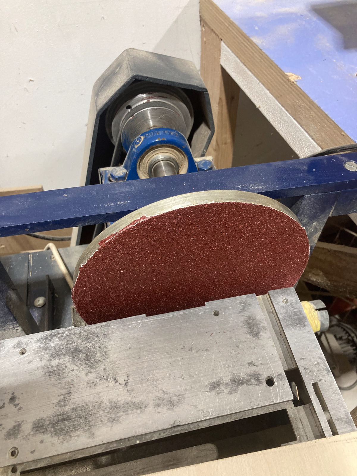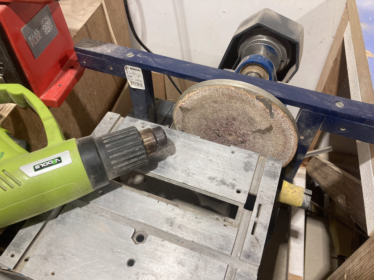 Prachtige machine om snel en gecontroleerd materiaal te vormen. Bijvoorbeeld om een ruw gezaagde vorm “naar de lijn” te schuren. Merk: zelfbouw door 'n mannetje uit Veendam, eigendom van Herman.