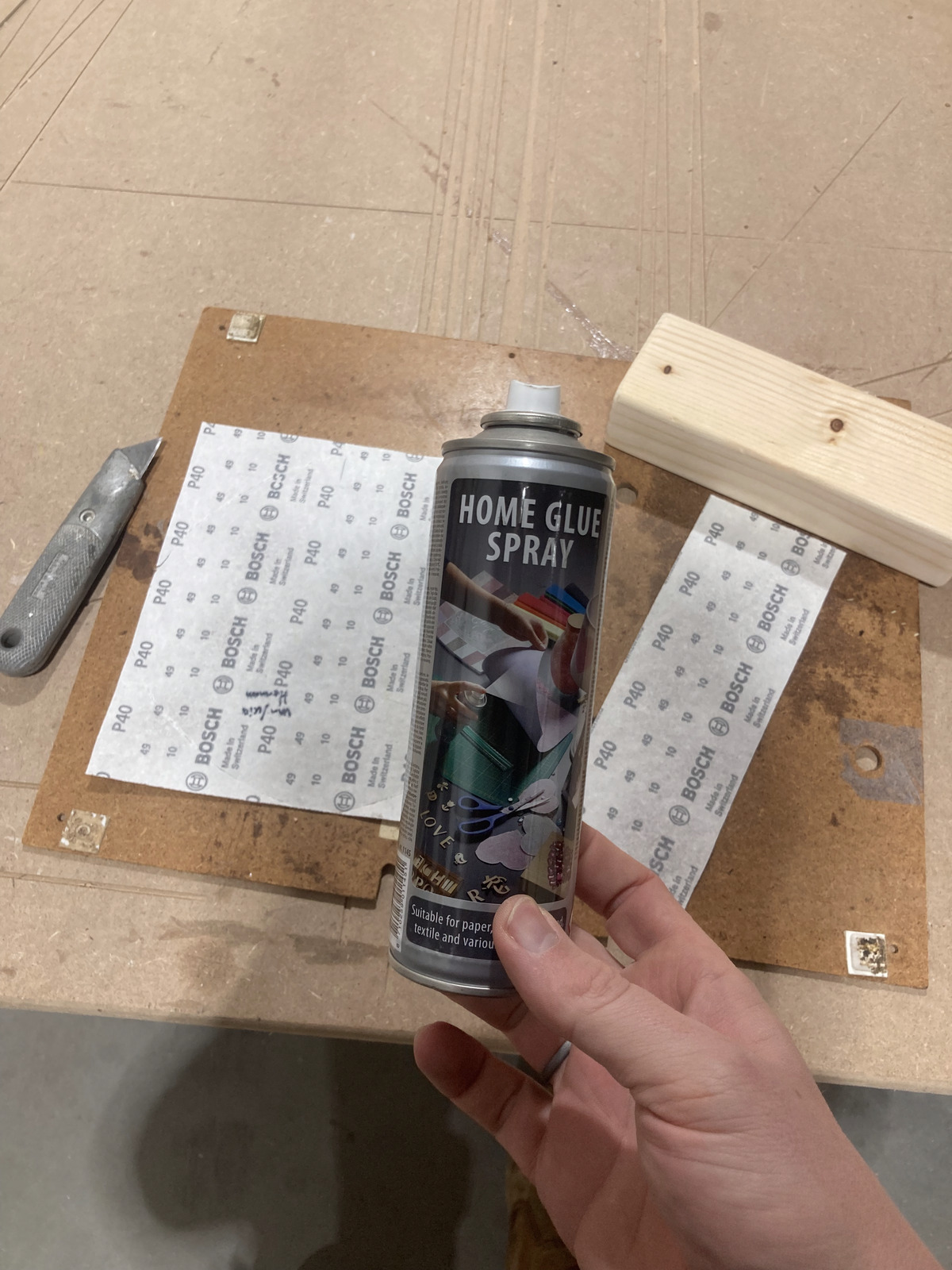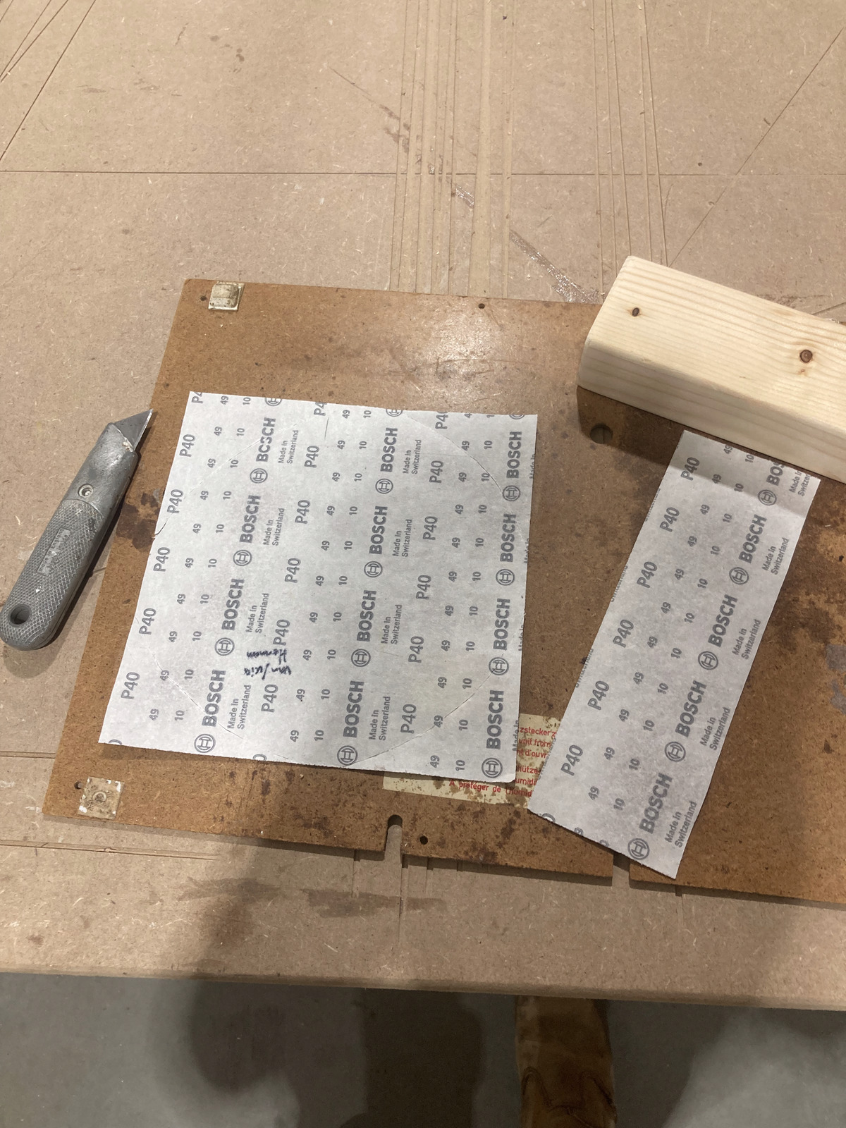 Het schuurpapier is een standaard schuurvel van de bouwmarkt (specifiek Bosch papier van Hornbach), grit 40 werkt goed. Bevestigd met spuitlijm (gewoon goedkoop hobbyspul). Vervangen: